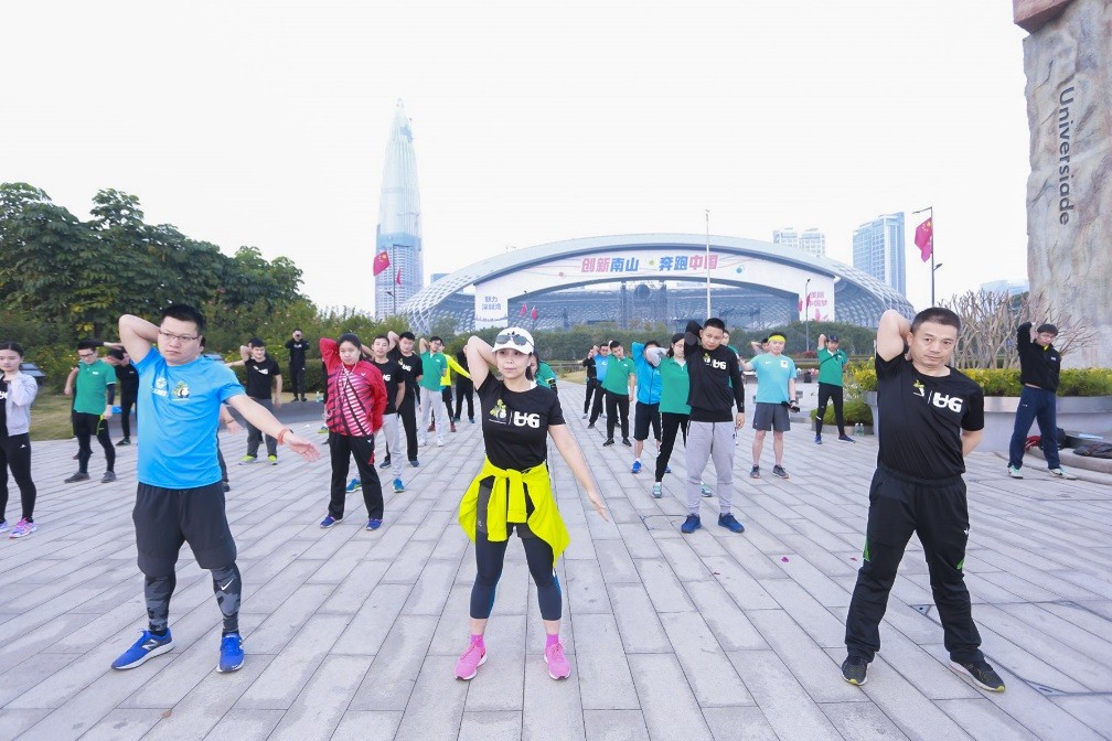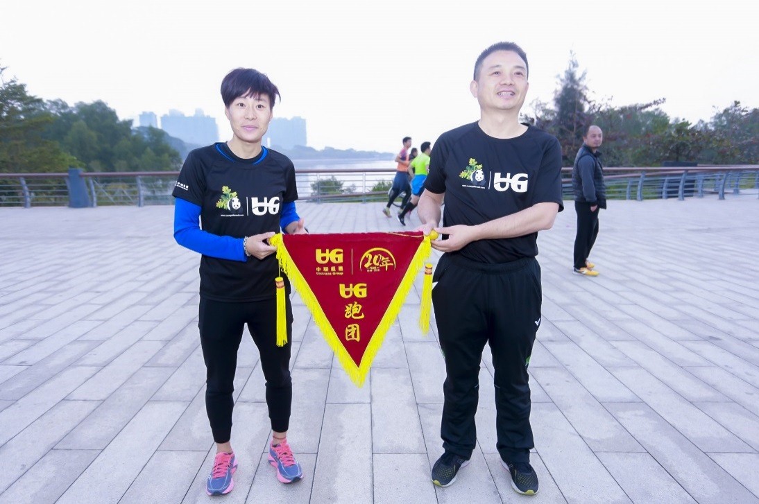 ? ? ? ?在深圳,晨曦中的深圳灣公園別有一番景致,早上7時(shí),深圳地區(qū)的小伙伴們已經(jīng)在大運(yùn)火炬塔廣場(chǎng)集合到位?;顒?dòng)伊始,UG跑步學(xué)堂總教頭李季教練向UG跑團(tuán)授旗,標(biāo)志著UG跑團(tuán)正式成立,開啟了跑團(tuán)的新元年。?